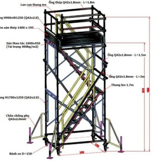 Công dụng: cầu thang dàn giáo dùng để công nhân linh hoạt di chuyển trong hệ dàn giáo, dễ thao tác và tạo đường đi lên xuống cho hệ dàn giáo khung, nêm, ringlock, bao che công trình.